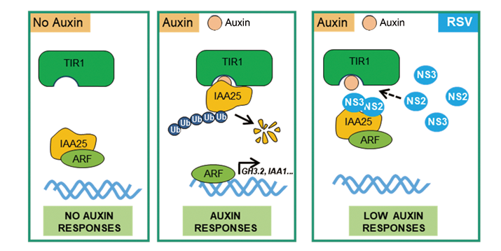 进一步研究发现,当感染RSV时,NS3特异性结合水稻OsIAA25蛋白抑制OsIAA25和OsTIR1的结合,从而抑制OsIAA25蛋白的降解过程。OsIAA25的积累会劫持OsARFs,抑制与生长素反应相关的基因的表达,进而抑制生长素信号通路,最终促进病毒的感染。NS2能够与NS3结合,二者协同显著增强了OsIAA25的稳定性。