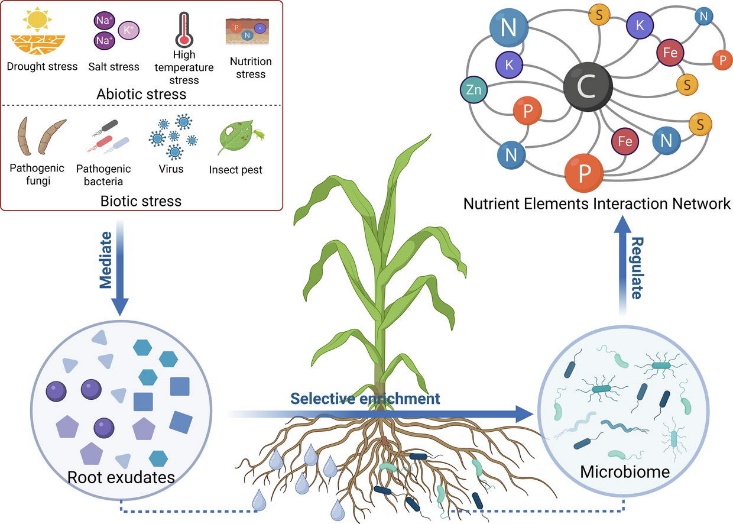 传统根际养分研究多聚焦单一元素,存在研究视角局限的问题。本论文立足植物-微生物互作核心领域,突破传统研究范式,创新性构建了“多元素协同—动态调控—适应性进化”的根际养分交换整合研究框架,从全新视角系统阐释了根际养分交换的网络特征与调控规律,明确了根系分泌物在根际养分交换中的核心地位,其既是植物与微生物跨界交流的“化学语言”,也是介导根际碳-养分互作的“代谢货币”,其碳量占植物净光合产物的21%。植物可通过主动调控根系分泌物组成,精准招募固氮菌、解磷菌等功能微生物,构建起 “碳供给-养分活化”的互利反馈循环,实现根际养分的高效活化与利用。同时,总结了根际多元素养分交换的协同互作规律,发现氮、磷等宏量元素与铁、锌等微量元素的根际交换并非独立进行,而是以微生物代谢冗余为纽带,以OsPHR2等信号枢纽为调控核心,形成了各元素相互关联、协同调控的紧密跨界互作网络,打破了单一元素养分交换的传统研究认知。此外,还阐明了根际养分交换策略的动态适配特性,植物可根据自身生长阶段、土壤基础环境,以及干旱、盐渍等非生物胁迫条件,灵活调整根系分泌物组分,定向招募功能或抗逆微生物,形成完整的应激调控闭环,保障不同条件下的养分获取与生长发育。