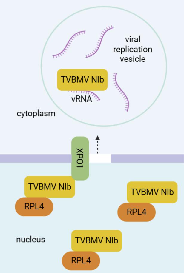 在此研究基础上,团队围绕核糖体蛋白调控烟草脉带花叶病毒侵染的分子机制,及其在作物抗病毒育种中的应用价值展开深入探索。在本研究中,发现非叶绿体定位的核糖体蛋白RPL4与烟草脉带花叶病毒NIb互作,而同属的马铃薯Y病毒和芜菁花叶病毒NIb均不存在互作。过表达RPL4抑制烟草脉带花叶病毒侵染,而不影响马铃薯Y病毒和芜菁花叶病毒侵染。进一步研究发现,RPL4对烟草脉带花叶病毒侵染的抑制程度与RPL4的核质分布呈正相关。RPL4通过干扰XPO1介导的NIb核输出,阻碍NIb向病毒复制囊泡转运而抑制烟草脉带花叶病毒侵染。该研究工作揭示了核糖体蛋白对植物病毒侵染的差异性调控机制,为抗马铃薯Y病毒属病毒的防控及作物育种提供重要理论依据。