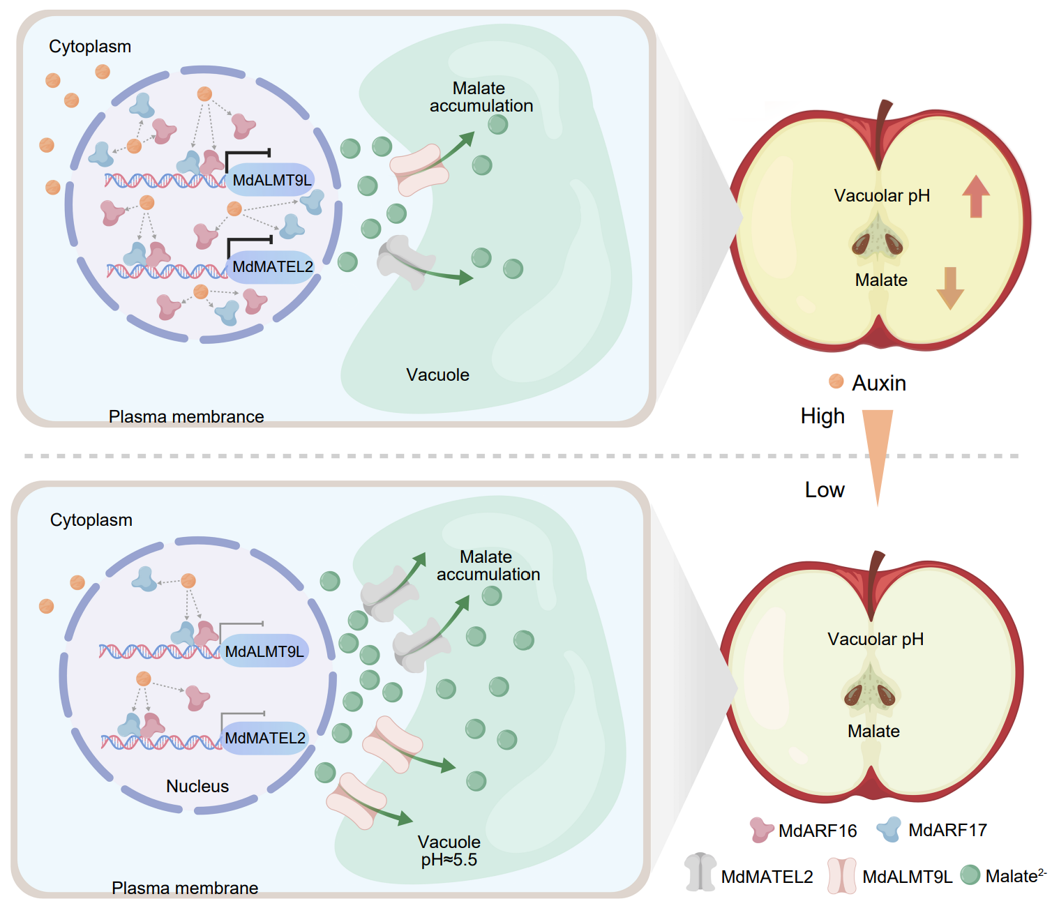 本研究在‘嘎啦’(Ma1ma1)ב藤牧一号’(Ma1Ma1)苹果杂交后代及果实发育过程中发现,生长素水平与苹果酸(主要有机酸)含量在Ma1Ma1和Ma1ma1基因型中均呈显著负相关关系,生长素抑制苹果酸积累不依赖于控制苹果酸度的主效位点Ma1。进一步通过分离群体分组分析法(BSA)与转录组测序(RNA-seq),鉴定出两个生长素响应因子MdARF16和MdARF17作为关键调控因子抑制苹果酸积累。功能验证表明Ma1同源蛋白MdALMT9L和多药及毒性化合物外排蛋白MdMATEL2是液泡膜定位的苹果酸转运蛋白,生长素抑制MdALMT9L和MdMATEL2基因的表达,而对Ma1无影响。在‘鲁丽’(杂交后代品种)苹果中进行机制分析表明,MdARF16和MdARF17协同作用,直接结合MdALMT9L和MdMATEL2的启动子并抑制其转录阻碍苹果酸由细胞质向液泡的转运从而降低苹果酸含量。综上,本研究揭示了一条独立于Ma1的生长素-MdARF16/17调控通路,该通路通过调控由胞质到液泡的苹果酸转运控制果实酸度,为基于生长素信号调控果实有机酸性状提供了新的分子机制框架。