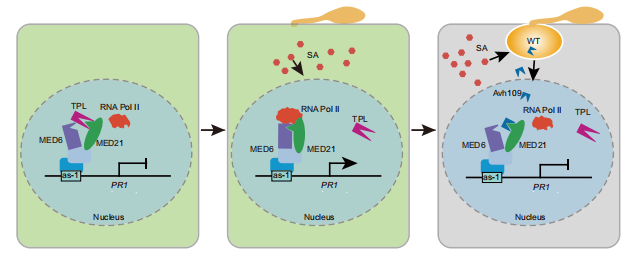 近日,植物保护学院王群青教授、农学院胥倩教授团队联合北京大学现代农业研究院陈苑研究员,在《自然·通讯》(Nature Communications)上发表了题为“PsAvh109 suppresses SA-triggered immunity by mimicking TPL function to disrupt mediator complex assembly”的研究论文,首次揭示了一种病原菌效应子通过分子模拟宿主转录抑制蛋白,从而精准破坏植物免疫基因转录机器的全新致病策略。