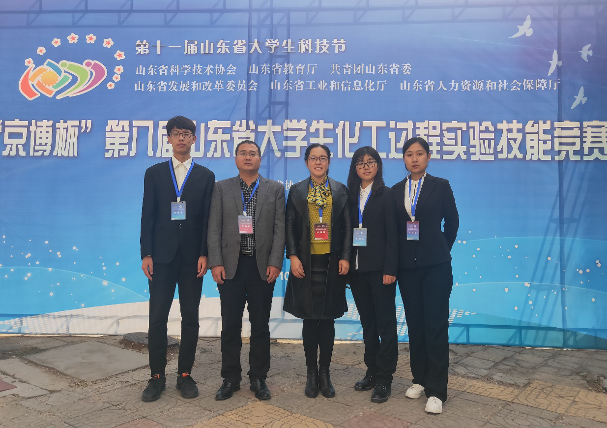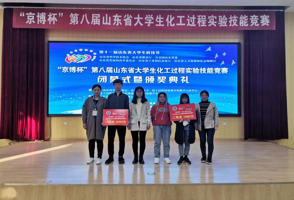 10月30日,2019年“京博杯”第八届山东省大学生化工过程实验技能竞赛在青岛科技大学落下帷幕。化工学子在本次竞赛中荣获一、二、三等奖各一项,其中化学工程与工艺2017级OMG队(孟嘉琦、王文君、王洁)荣获一等奖, “驭梦队”(杨静、周蔷、张朵朵)摘得二等奖,“啥也不会队”(张鹏、翟林晓、张文飞)获得三等奖。徐冬梅、张治山、高军、李敏和马小隆等担任指导教师。