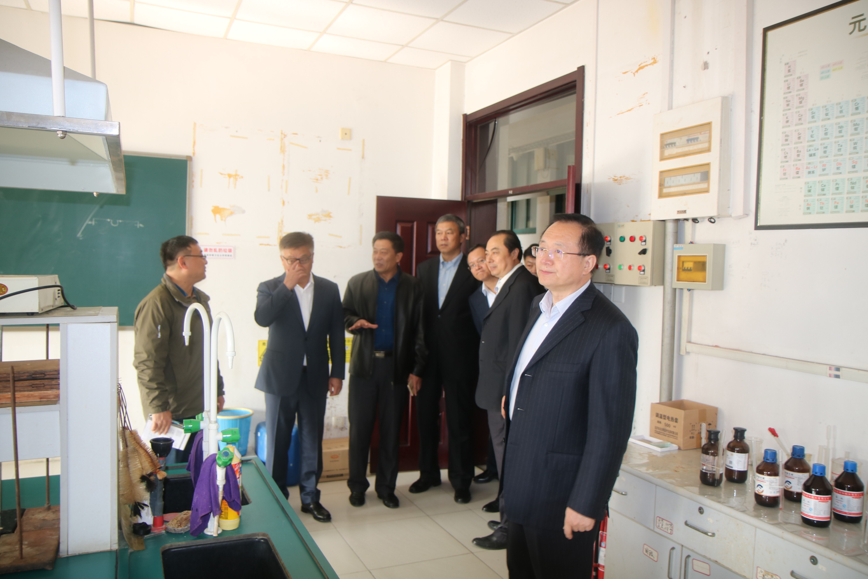 考察团领导对学院有机化学实验室、无机与分析化学实验室等基础化学实验室、专业实验室、科研实验室及矿物加工模拟仿真实验室进行了全面考察,分别听取了实验室负责人的汇报讲解,并与师生亲切交流。每到一处,考察团领导都饶有兴趣,不停地询问、交流,对实验室建设及实验设施情况进行了深入了解,对科研团队取得的成果和发展方向表示赞赏,对进一步加强实验室建设及科研教学工作提出指导意见。(徐华坤)