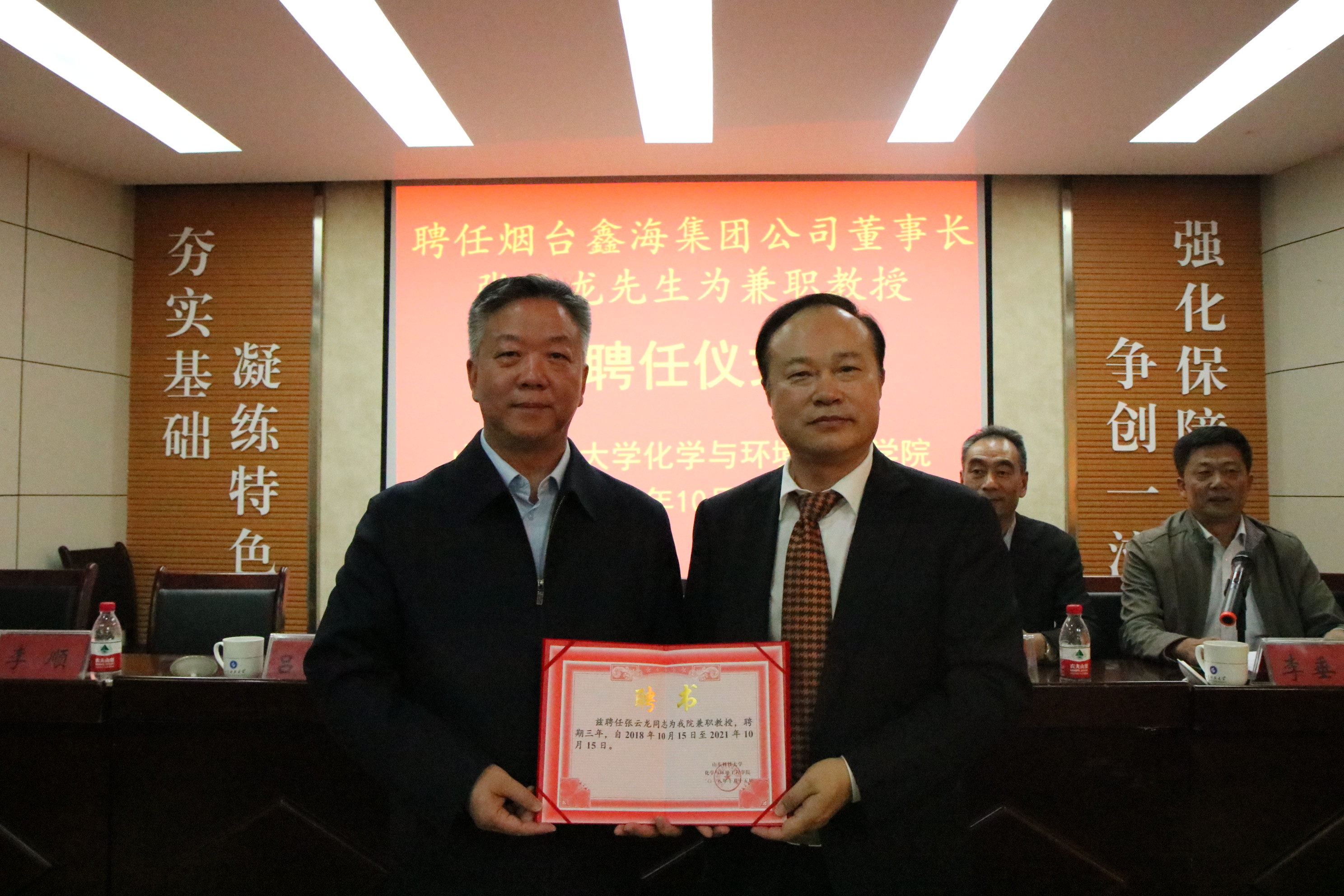 10月15日,澳门信誉最好十大平台举行兼职教授聘任仪式,烟台鑫海集团公司董事长张云龙受聘为学院兼职教授。烟台鑫海矿业集团公司董事长张云龙、行政总监韩卿旺一行五人受邀出席聘任仪式。澳门信誉最好十大平台党委书记李垂文,学院院长吕宪俊出席聘任仪式,学院部分师生参加了上述活动。