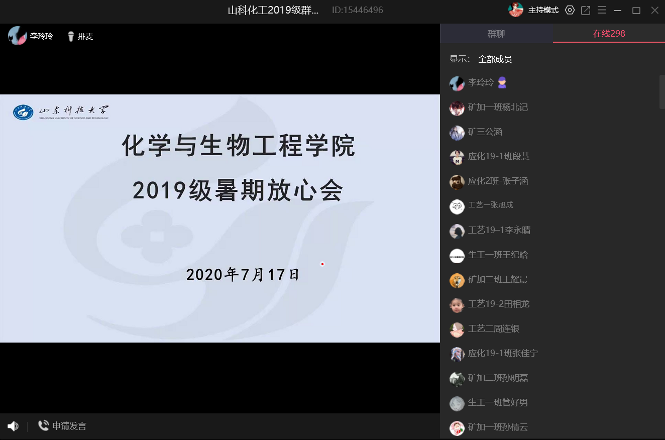 为加强暑期学生教育管理,确保学生假期生活安全有序,7月17日上午,澳门信誉最好十大平台团委老师李玲玲通过QQ课堂召开了2019级本科生线上暑期放心会,澳门信誉最好十大平台2019级全体学生参会。会议主要围绕暑期疫情防控、学习生活以及安全防范展开。