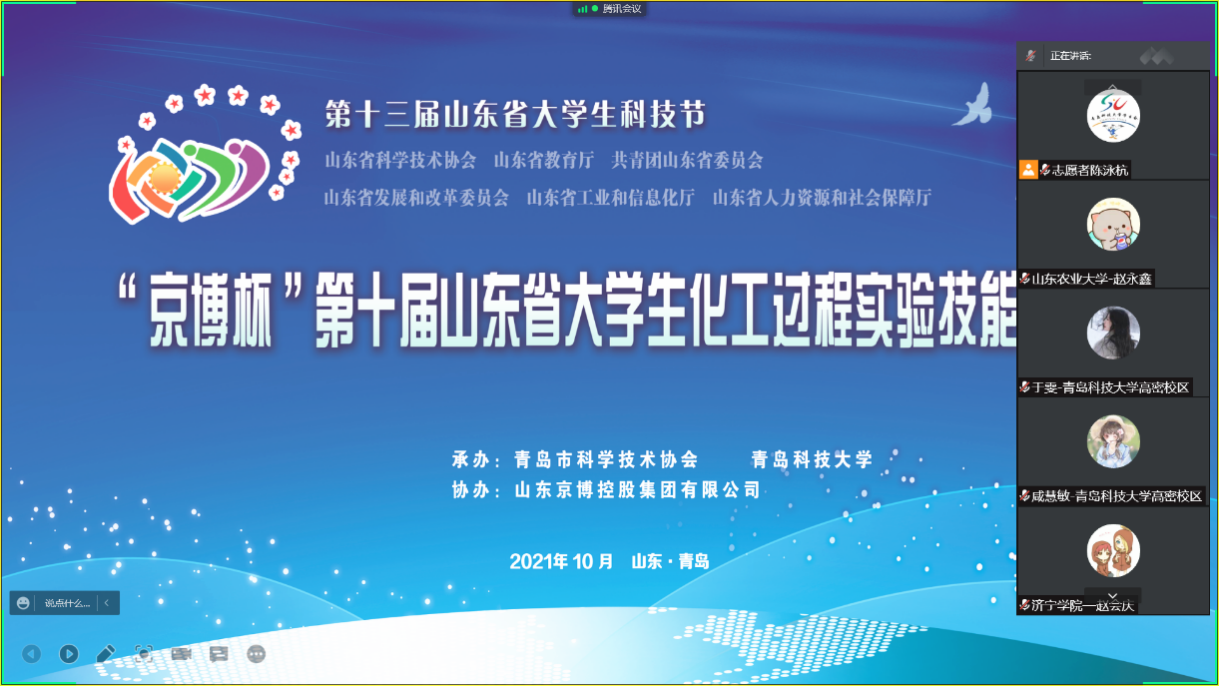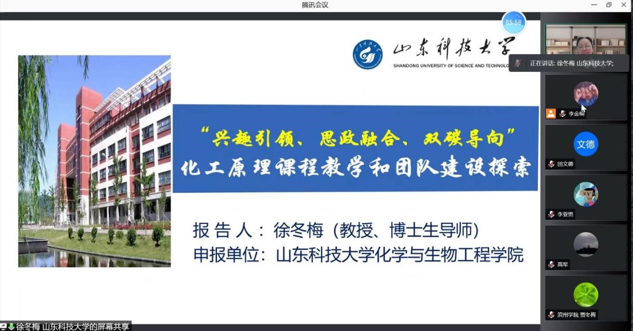 在竞赛期间,由山东省大学生化工过程实验技能竞赛委员会、化工过程国家级实验教学示范中心(青岛科技大学)联合主办的“全省化工专业一流课程线上教学研讨会”在10月31日下午召开。受组委会邀请,澳门信誉徐冬梅教授在会议上作了题为“兴趣引领、思政融合、双碳导向”化工原理课程教学和团队建设探索的一流课程建设专题报告,和参会的50多位专家分享了我校在化工原理课程和一流课程建设方面的成果和经验,取得了良好的交流效果。