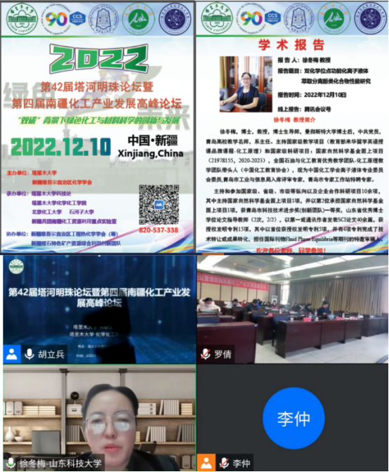 2022年12月10-12日,“第42届塔和明珠论坛暨第4届南疆化工产品发展论坛”在新疆塔里木大学成功举办。会议的主题为“双碳”背景下绿色化工与材料科学的创新与发展。中国化工学会离子液体专业委员会委员、我校徐冬梅教授应邀作了题为“双化学位点功能化离子液体萃取分离酚类化合物的研究”的大会报告,分享了离子液体萃取分离煤热解油中酚类化合物领域所做出的前瞻性研究和成果。此次年会由新疆维吾尔自治区化学学会和塔里木大学主办,由塔里木大学、北京化工大学、石河子大学和新疆兵团南疆化工资源利用工程实验室联合承办。