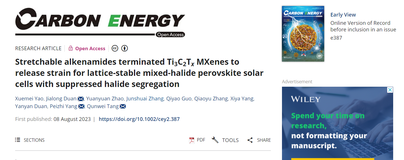 近日,澳门信誉最好十大平台段加龙副教授(学术教授)、唐群委教授等人在全无机钙钛矿太阳能电池领域取得最新进展,相关成果以“Stretchable alkenamides terminated Ti3C2Tx MXenes to release strain for lattice-stable mixed-halide perovskite solar cells with suppressed halide segregation”为题发表在权威期刊Carbon Energy上(中科院Top一区,影响因子:20.5)。