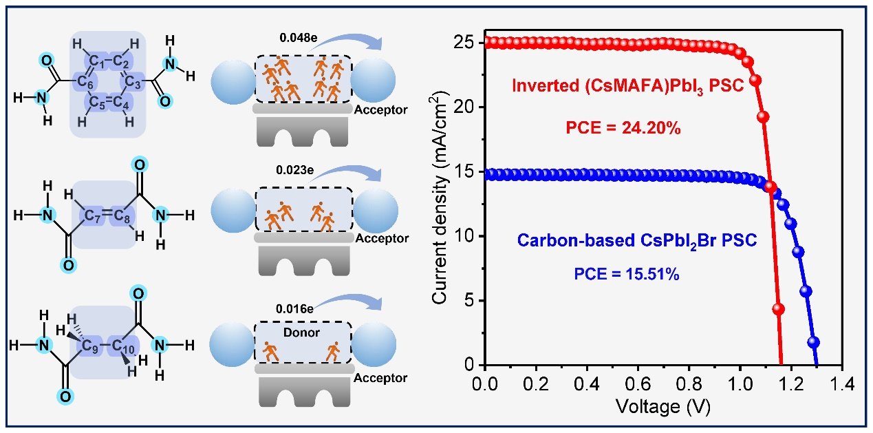 基于路易斯酸碱反应钝化钙钛矿薄膜中的缺陷一直是获得高效稳定钙钛矿太阳能电池的先决条件,因此,深入了解分子结构与钝化能力之间的作用关系对钝化剂的筛选具有重要意义。团队以双头酰胺分子为研究对象,通过系统调节中间给体的骨架结构,结合电池的光伏性能变化,从自旋态电子、给受体能级结构、分子共面性等角度,系统阐述了分子内电荷转移量的影响因素,并量化了该数值,为高效钝化剂的选择提供了依据。通过优化,苯环给体在提高钙钛矿薄膜质量方面具有较好的效果,最终碳基、全无机的CsPbI2Br太阳能电池显著提高了15.51%的效率,并显著提高了稳定性。基于同样的原理,在倒置太阳能电池上进一步获得了24.20%的光伏效率。