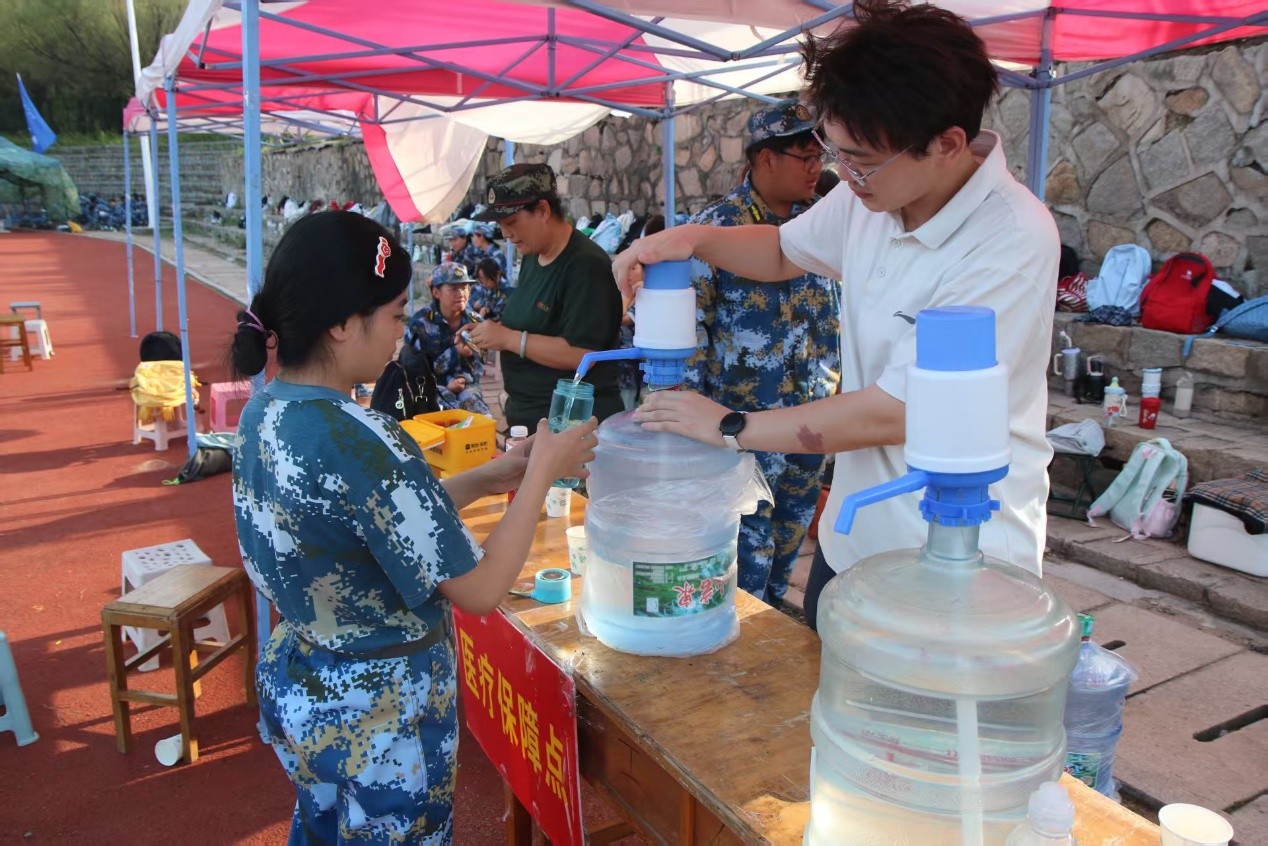 针对军训期间天气炎热、体能消耗大的情况,学院在训练场周边设置多处 “饮水补给点”。补给点不仅配备了大容量桶装水及手动按压式取水器,还安排志愿者协助新生接水、续水,有效避免排队拥堵,确保每位同学能够在训练间隙及时补充水分。