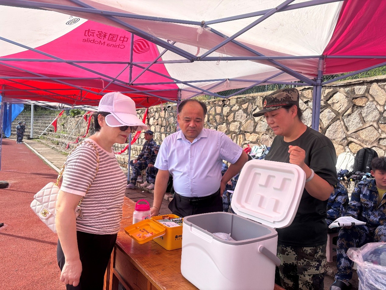 田书记细致检查了饮水供应、防暑药品等物资储备情况,仔细清点了冷藏箱内清凉用品的种类与数量,积极协调供水厂家,确保大桶水及时充足供应。她与带训教官、辅导员深入交流,详细了解训练进展和学生身体状况,对大家的辛勤付出表示感谢,强调要持续密切关注学生身心状态,全力做好各项服务保障,为同学们提供坚实可靠的后勤支持。