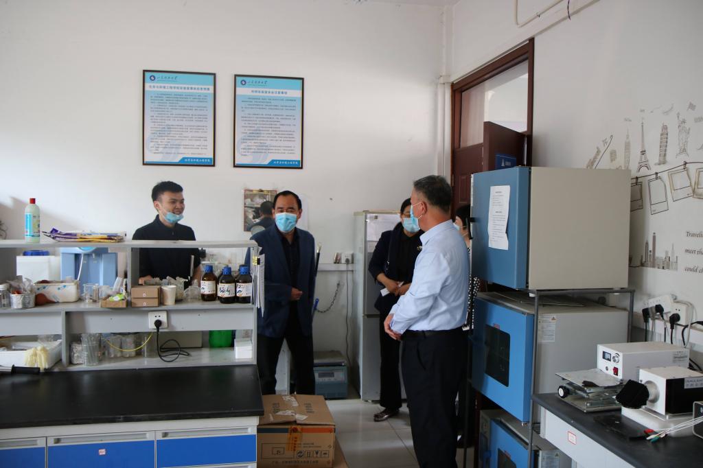 曾校长一行来到学院科研实验室,对实验室卫生情况、日常消杀制度、值班安排、实验用品摆放等内容进行了检查,仔细询问了申请返校学生的情况,查看了研究生科研实验室的学习工作环境。吕院长向曾校长详细介绍了疫情防控期间实验室管理办法和各项安全保障措施,学院根据学校本学期开学工作安排,精准摸排返校学生信息,坚持“一人一策”原则制定学生返校工作方案,并对返校学生所用实验室进行了专项消毒清扫,确保学生复学后拥有一个安全健康的实验室环境。