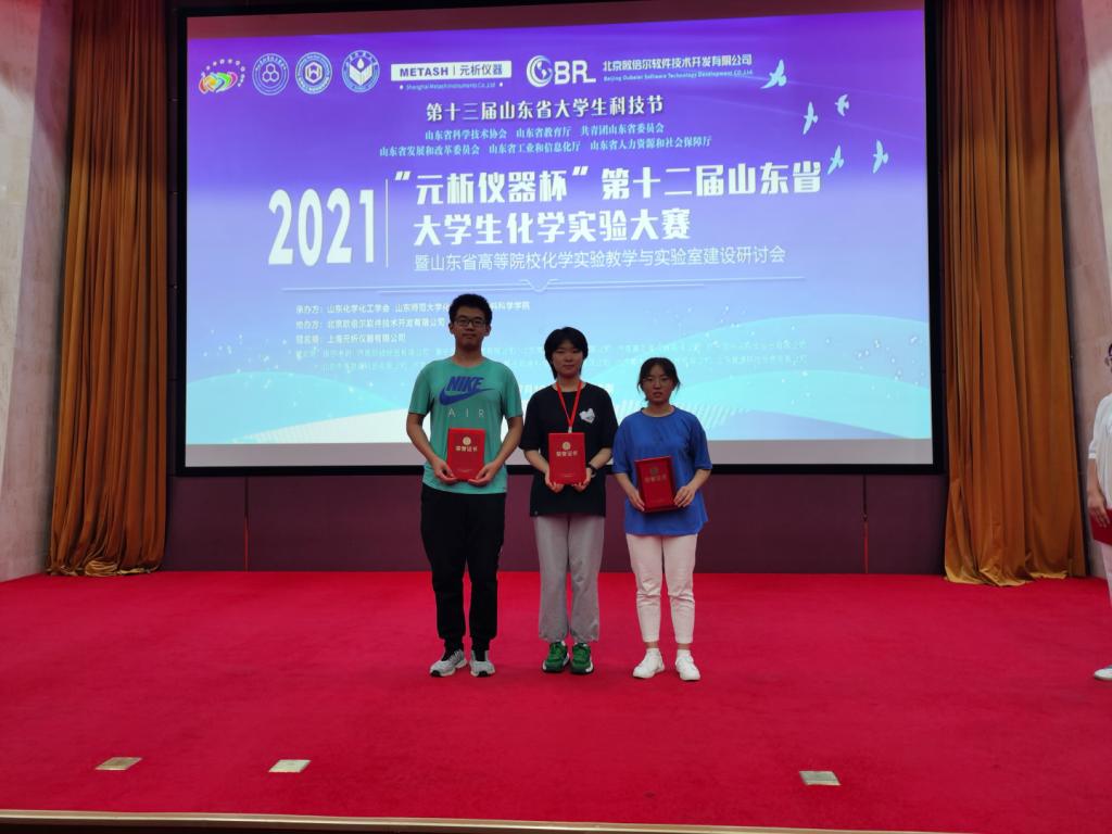 7月19日至22日,“元析仪器杯”第十二届山东省大学生化学实验大赛暨山东省高等院校化学实验教学与实验室建设研讨会在济南举行,澳门信誉应用化学专业学生高帆、尚琳卿同学荣获大赛一等奖,高梦悦同学荣获二等奖,刘青云、王鹏、黄永清担任指导教师。