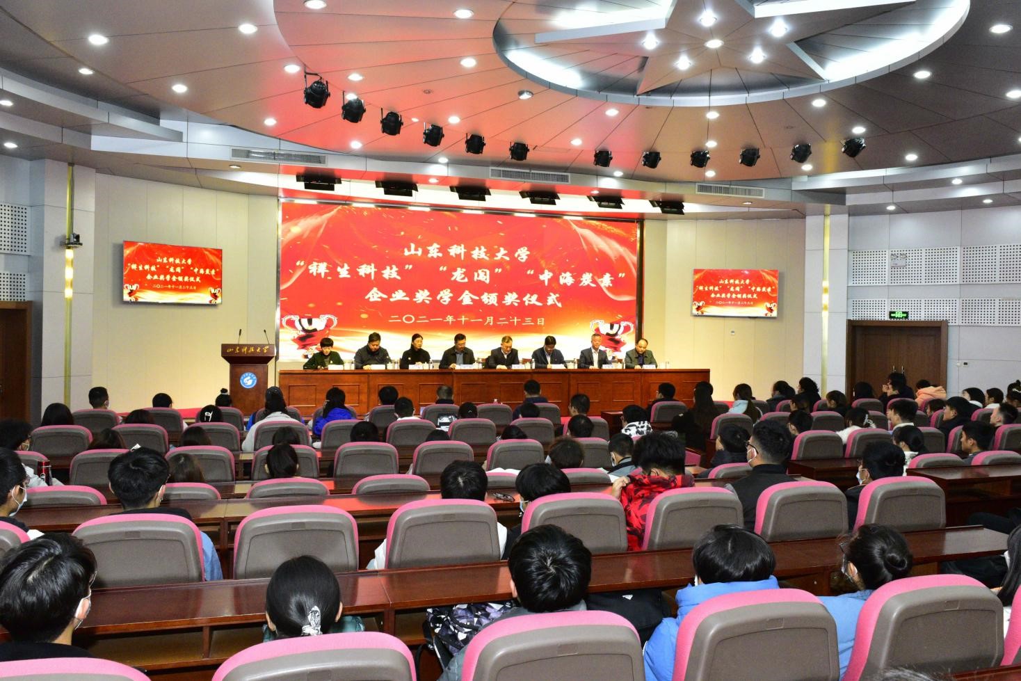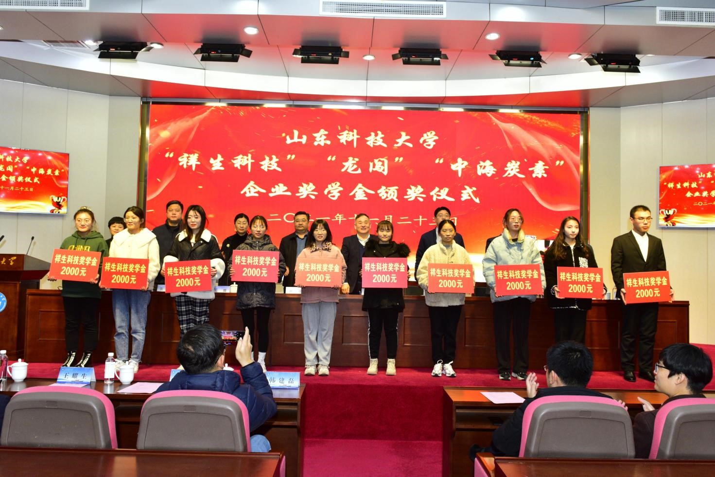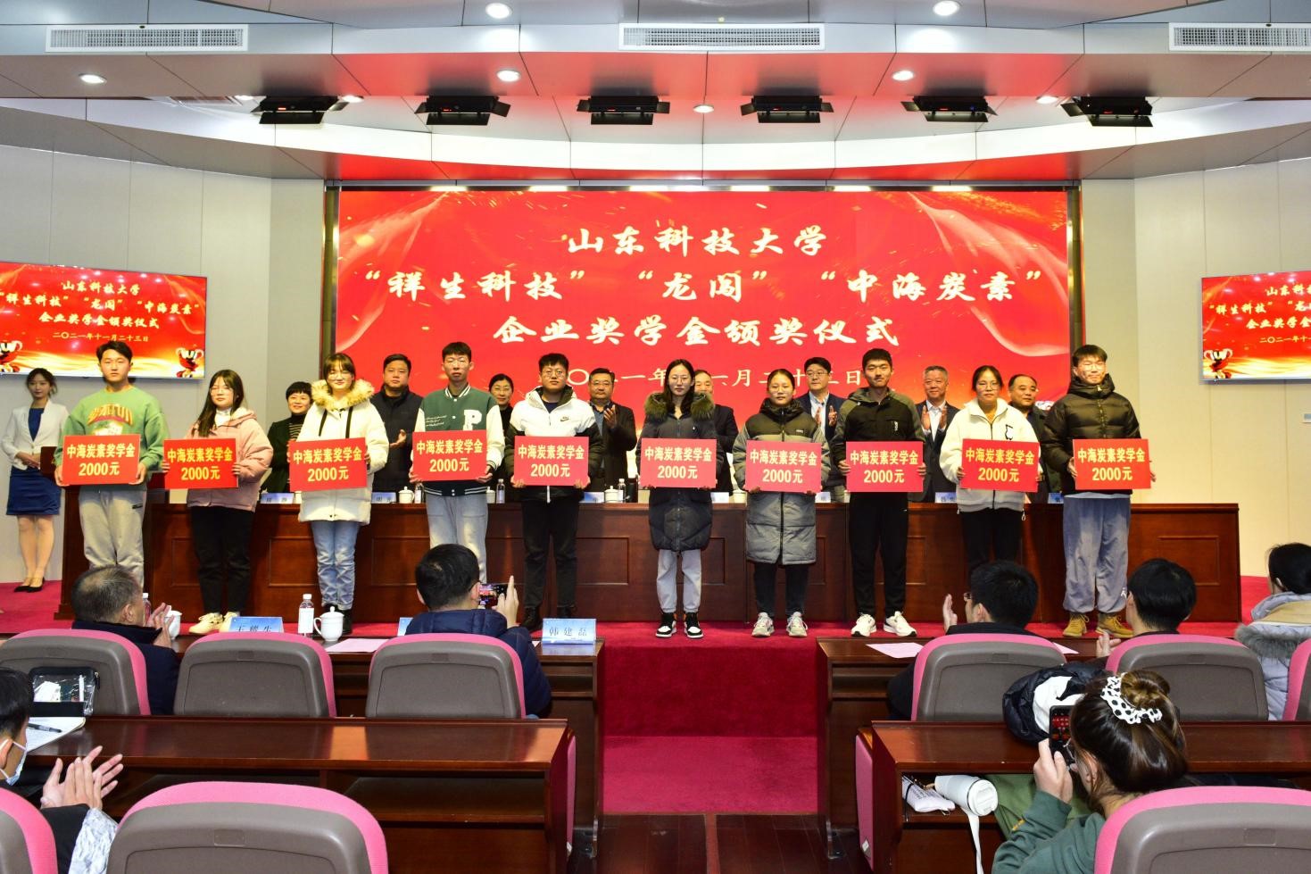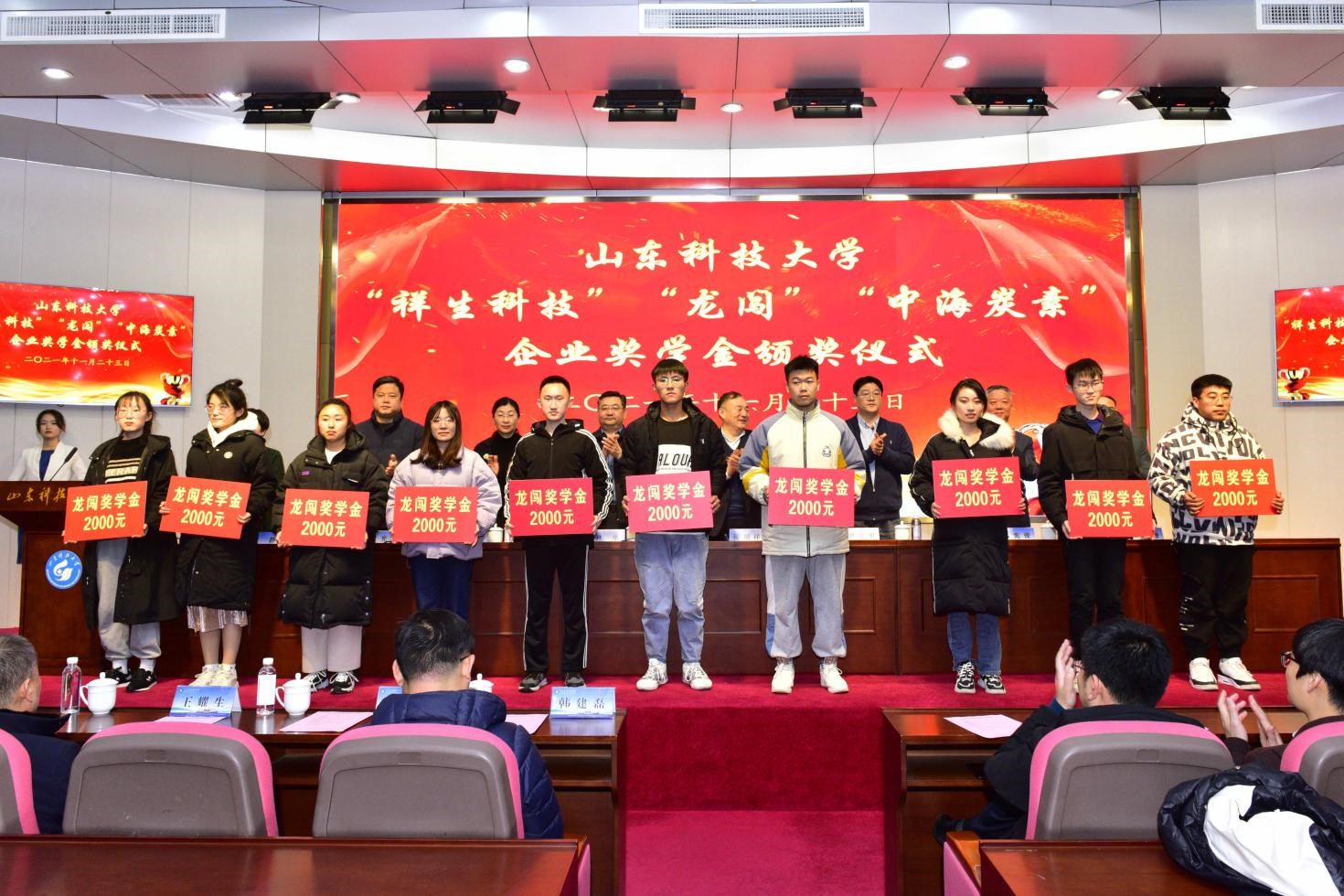 仪式上,澳门信誉最好十大平台党委书记窦存增宣读《澳门十大信誉网赌大全关于颁发2021年度“祥生科技”奖学金、“龙闯”奖学金、“中海炭素”奖学金的决定》,共60名学生获得奖学金,与会领导嘉宾为获奖学生颁发了奖学金。