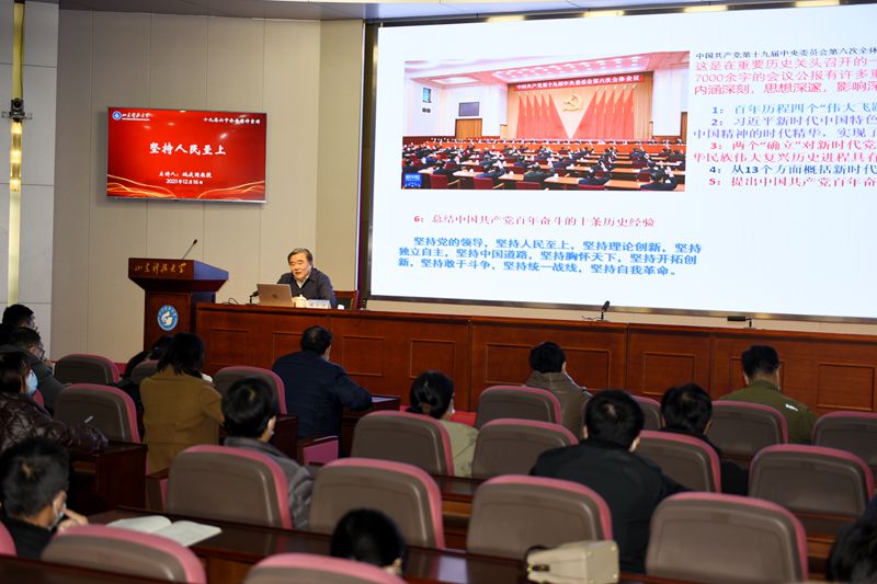 姚庆国以“坚持人民至上 推进学校高质量发展”为题,在介绍《中共中央关于党的百年奋斗重大成就和历史经验的决议》框架和特点的基础上,向师生们解读了决议中的百年历程四个“伟大飞跃”、习近平新时代中国特色社会主义思想“是中华文化和中国精神的时代精华,实现了马克思主义中国化新的飞跃”、两个“确立”对新时代党和国家事业发展和推进中华民族伟大复兴历史进程具有决定性意义、13个方面概括新时代发展成就、中国共产党百年奋斗的五方面历史意义、中国共产党百年奋斗的十条历史经验等内容。
