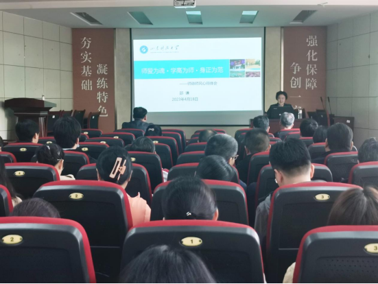 邵谦老师从自身经历出发,结合教育教学的心得体会,就师德师风建设与大家进行了深入交流:师爱为魂——要热爱教育事业,热爱学生、做学生的良师益友;学高为师——教师的首要任务就是要做好教学工作,不仅要有专业的学科知识,过硬的教师技能,更重要的还要有不停进取的心;身正为范——既要教书,又要育人,课内外都要言传身教,要有无私奉献、爱岗敬业的精神,无德无以为师。