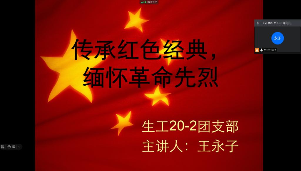 为传承红色精神,致敬革命先烈,4月4日,生物工程2020-2班开展主题为“重温经典,缅怀先烈”的清明节专题云团日活动。本次活动由生物工程2020-2班团支部的书记王永子主持,支部全体团员参与。首先,全体成员齐唱国歌献给英勇牺牲的革命先烈。随后,团支书在线播放英雄纪录片,重温红色经典,并向同学们介绍了一些革命先烈代表的英雄事迹,班内同学也积极参与,分享了许多红色故事。最后,团支书组织同学们一起线上默哀送花,缅怀革命先烈。活动结束后,同学们纷纷表示,现在的美好生活来之不易,我们应该铭记为中华民族和中国人民作出贡献的英雄们,继承和弘扬红色精神和革命传统,做好红色基因传承,为实现中华民族伟大复兴而努力奋斗。