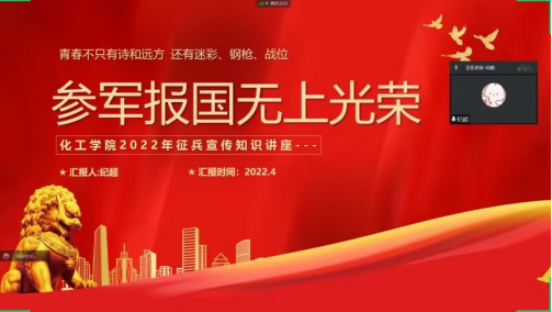 为激发学生报效祖国、应征入伍的热情,进一步增强化工学子对国防与征兵知识的了解,4月20日澳门信誉最好十大平台召开大学生应征入伍线上宣讲会,退役复学优秀学生纪超担任宣讲人。宣讲会由满灏老师主持。