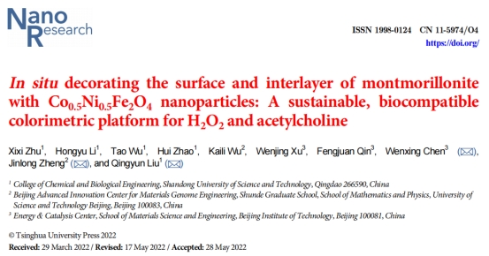 相关成果以“In situ decorating the surface and interlayer of montmorillonite with Co0.5Ni0.5Fe2O4 nanoparticles: A sustainable, biocompatible colorimetric platform for H2O2 and acetylcholine”为题发表在国产旗舰期刊Nano Research上(最新IF10.269)。论文第一作者为主曦曦高级实验师,第二作者为2020级硕士研究生李洪禹,刘青云教授为论文通讯作者。该研究得到了国家自然科学基金项目21904175,21971152、山东省“青创团队”和澳门十大信誉网赌大全人才计划项目“菁英计划”的资助。文章链接:https://link.springer.com/article/10.1007/s12274-022-4594-x,文章DOI:10.1007/s12274-022-4594-x