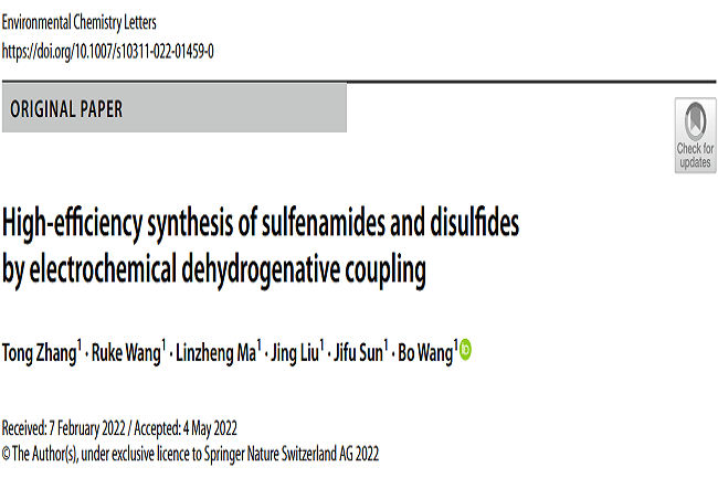 近日,澳门十大信誉网赌大全澳门信誉最好十大平台王博教授团队在次磺酰胺/二硫化合物的电化学脱氢偶联绿色催化领域取得了新进展。相关成果以“High‑efciency synthesis of sulfenamides and disulfdes by electrochemical dehydrogenative coupling”为题发表在国际知名学术期刊Environmental Chemistry Letters上(最新IF 13.615)。