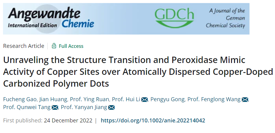 近日,澳门信誉最好十大平台唐群委教授以澳门十大信誉网赌大全为通讯单位在材料和化学领域顶级刊物Angewandte Chemie International Edition上发表了题为“Unraveling the Structure Transition and Peroxidase Mimic Activity of Copper Sites Over Atomically Dispersed Copper-Doped Carbonized Polymer Dots”的研究论文。