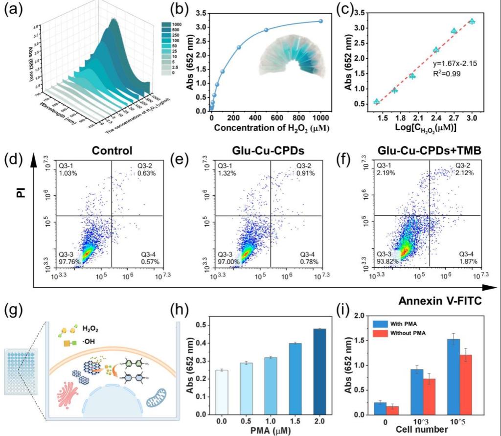 图4. Glu-Cu-CPDs在检测Hela细胞中过氧化氢的应用。