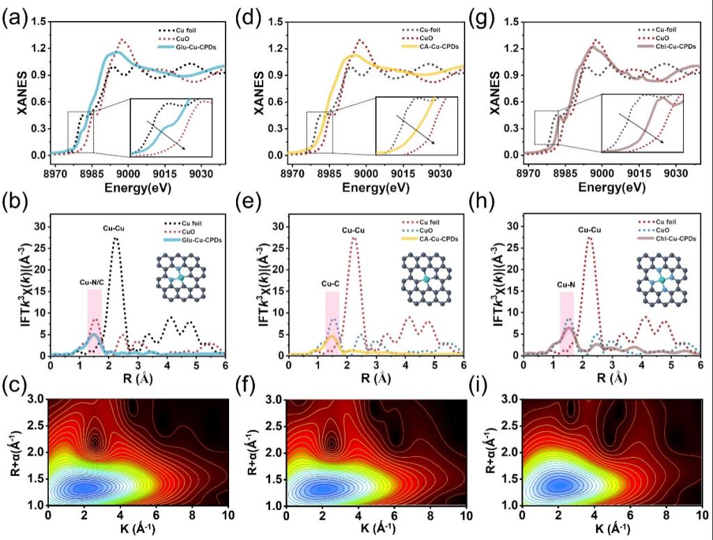 澳门信誉最好十大平台唐群委教授联合山东大学蒋妍彦教授挑选了三种具特定初始结构的Cu络合物,分别是柠檬酸铜(具有Cu-O4的初始结构)、谷氨酸铜(具有Cu-N2O2的初始结构)、叶绿素铜(具有Cu-N4的初始结构),并通过水热法分别制备了CA-Cu-CPDs、Glu-Cu-CPDs以及Chl-Cu-CPDs。XANES表征揭示了这三种Cu掺杂CPDs中Cu原子的配位环境分别为Cu-C4.2、Cu-N2C2以及Cu-N3.9。这表明在水热条件下,Cu-N键能够保持稳定,而Cu-O键不稳定,会被Cu-C键取代。这一现象为制备具有特定结构的TMAs-doped-CPDs提供了指导。