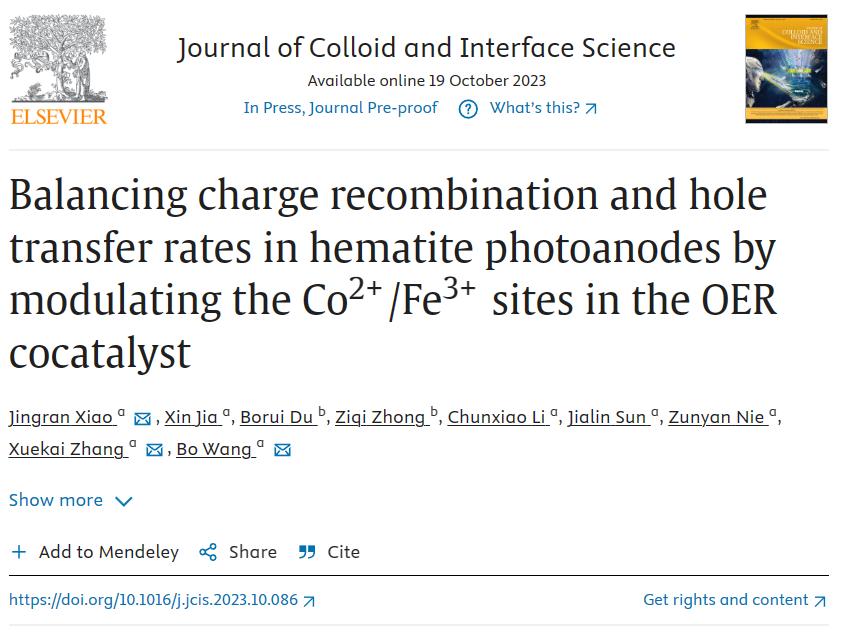 近日,澳门信誉最好十大平台肖静冉(学术教授)、王博(教授)等人在光电催化水分解领域取得最新进展,相关成果以“Balancing charge recombination and hole transfer rates in hematite photoanodes by modulating the Co2+/Fe3+ sites in the OER cocatalyst”为题发表在国际知名学术期刊Journal of Colloid and Interface Science上(中科院一区Top,影响因子:9.9)。