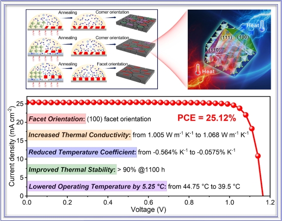 钙钛矿太阳能电池因具有光电转换效率高和制备工艺简单等优势已成为太阳能光伏领域的前沿技术。但钙钛矿太阳能电池的长期稳定性已严重制约了其商业化进程。大量研究工作聚焦于通过改善钙钛矿薄膜质量以提升晶格稳定性。在实际应用过程中,钙钛矿太阳能电池的温度会随着持续光照逐渐上升,尤其是在光照比较充足的季节,这对最大功率输出和稳定性构成挑战。针对这一行业共性关键问题,澳门十大信誉网赌大全化学与生物工程学院段加龙&唐群委等人创新性地研究了钙钛矿薄膜不同晶面结构与热导之间的依赖关系,揭示了混合阳离子钙钛矿中晶面依赖的热力学特性背后的机制。研究结果表明,(100)晶面具有比(110)和(111)晶面更高的热导率。通过埋入式和体相改性精确控制(100)晶面取向,目标钙钛矿薄膜的热导率可以从1.005提高到1.068 W m-1 K-1,加速了热量传输和散发,使得钙钛矿太阳能电池的平衡温度降低了5.25 oC。该项工作不仅获得了25.12%的光电转换效率,同时也表现出非常优异的热稳定性。相关成果发表在eScience期刊上,澳门十大信誉网赌大全为第一单位,联合培养博士生李佳保为第一作者。