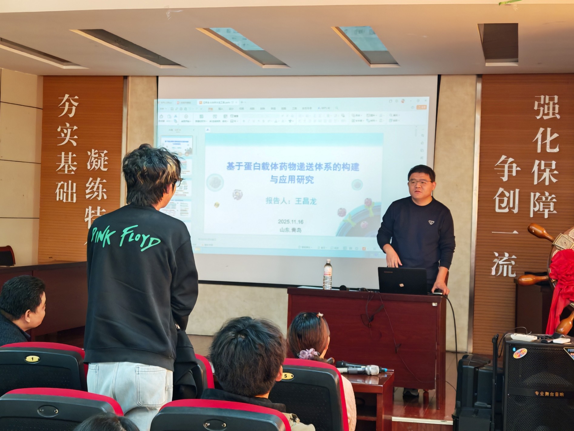 2025年11月16日上午,化学与生物工程学院生物工程专业2011级优秀校友、山东第一医科大学王昌龙教授回访母校,并在J2-104报告厅为师生带来题为《基于蛋白载体的药物递送体系的构建与应用研究》的学术报告。报告会由生物工程系副主任赵辉教授主持。